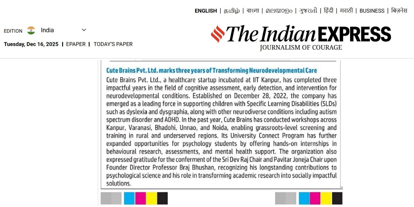 Cute Brains Pvt. Ltd. is an incubated company of Indian Institute of Technology, Kanpur, India. We work on Behavioural & Cognitive Assessment, Detection, diagnosis and certification for Specific Learning Disability and provide sale and service of assistive tools and applications. Its most valued product/service is Assistive Application for Children with Dyslexia & Dysgraphia (AACDD)